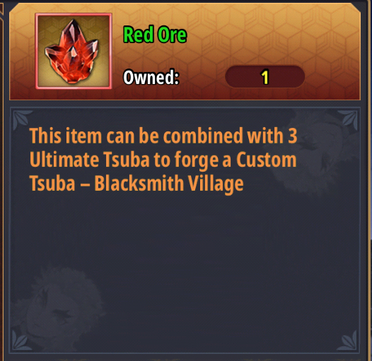 *Note: 3 Peak Tsuba + 1 Red Ore can be crafted into 1 Blacksmith Village Special Tsuba