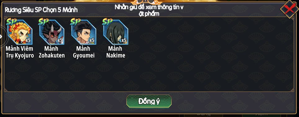 | 49,99$ | Rương Siêu SP Chọn 5 Mảnh x8, Rương Bảo Vật Tốc Đánh x1, Đá Kháng Cấp 5 x1, Mảnh Akaza x50 | |||||||